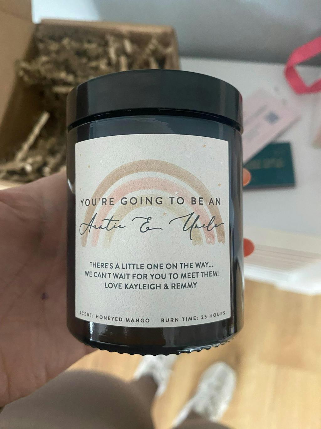 The pale cream label features a delicate watercolour rainbow illustration at its centre, finished with cute little stars dotted all around. The text reads 'You're Going To Be An Auntie & Uncle' in a pretty combination of modern and feminine script fonts. Below there is space for a personalised message, along with the candle's scent details and burn time. Using this candle as part of your pregnancy reveal is a sure way to make the Auntie & Uncle to be feel special, loved and above all, excited!