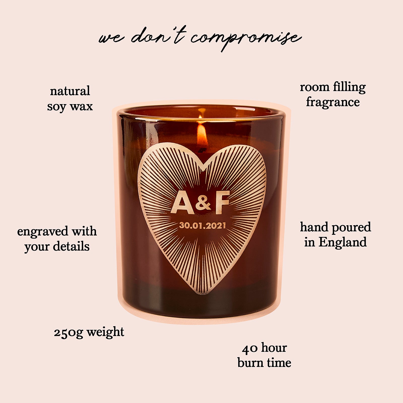 The centrepiece of this set is a 250g hand-poured soy wax candle, uniquely personalised with your and your partner's initials alongside a special date that defines your story, creating a beautiful, scented memento.