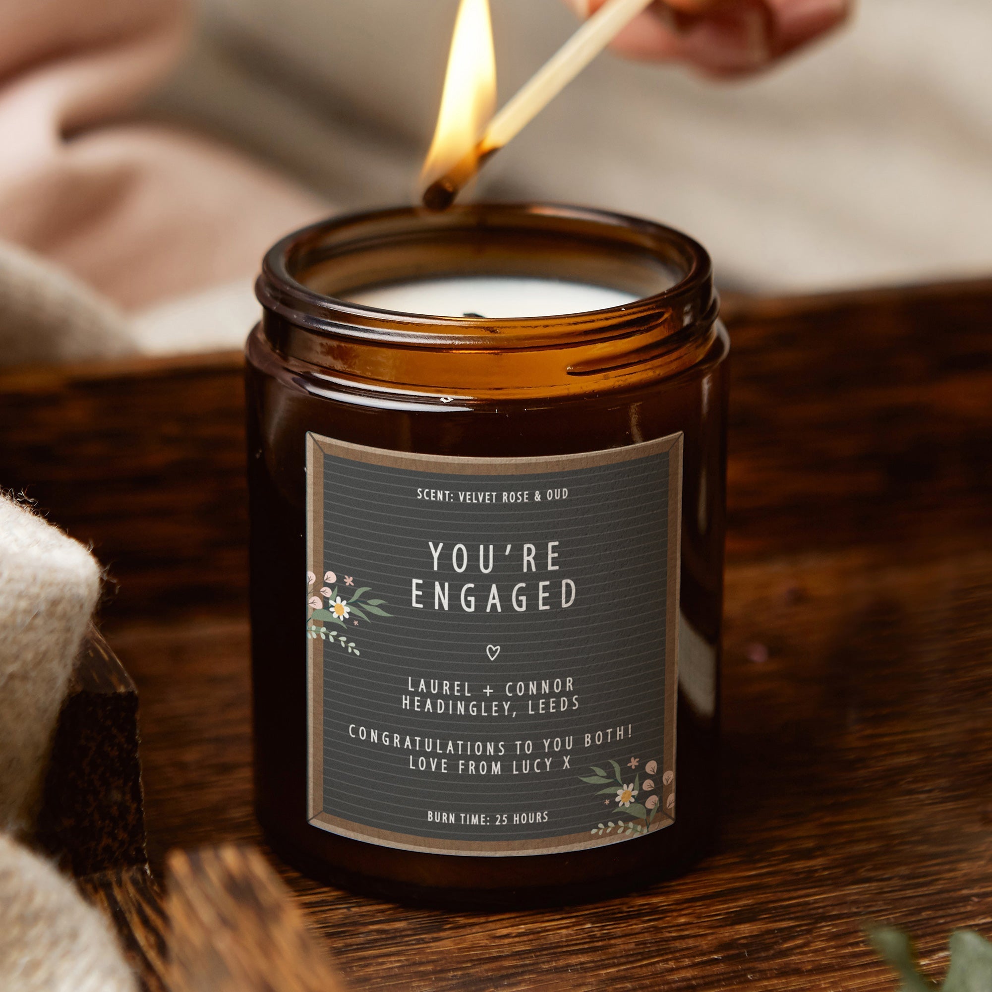 Our range of personalised engagement gift candles feature the couple's names, engagement date and location on many of the candles to celebrate the happy news. Our gifts are perfect for couples, friends and family and are available in different sizes and unique scents so you can find the perfect gift for the couple or bride to be.