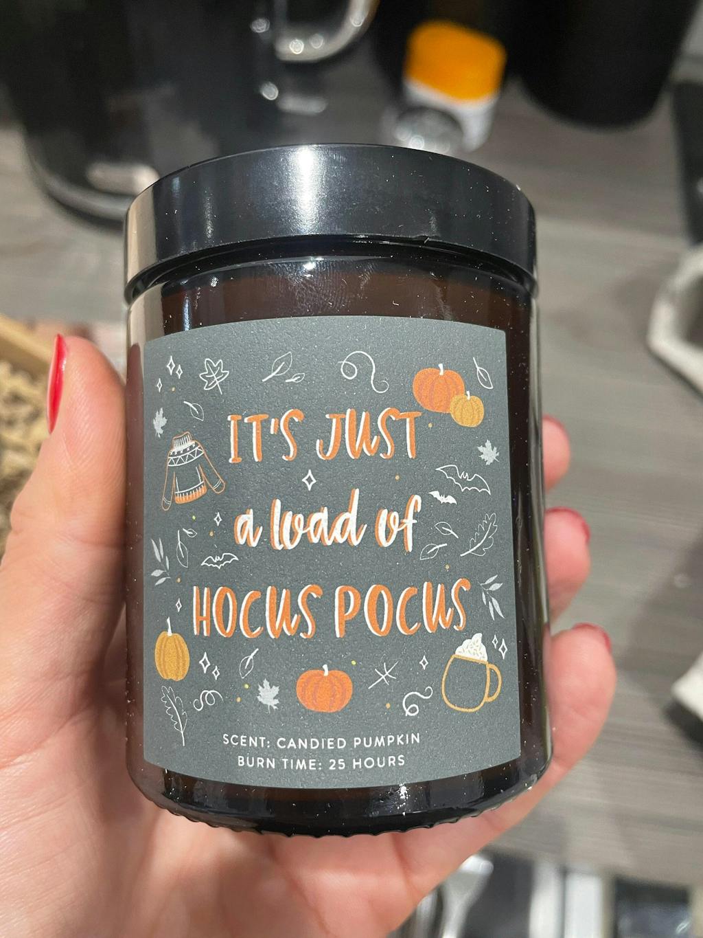 A fun Halloween themed candle perfect to style your own home for Halloween. The message on the candle reads 'It's Just A Load Of Hocus Pocus' and is surrounded by fun Halloween and Autumn themed illustrations including pumpkins and a cosy jumper. A stylist treat for yourself this October!