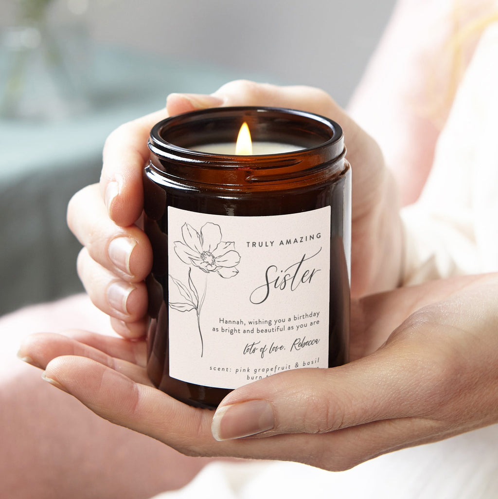 The feminine pale pink label features a pretty flower design, your personalised message along with your chosen scent and burn time. Romantic, handwritten fonts combined with a sketchy floral illustration give this candle a delicate look. A thoughtful sister birthday gift.